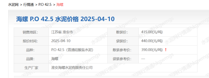 基期日价格:2025年4月10日中国水泥网-淮安地区淮安海螺水泥(PO42.5)散装价:415元/吨。